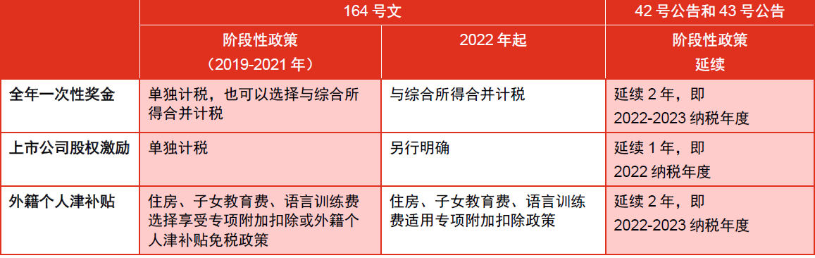 延续2018年12月由财政部、税务总局发布的《关于个人所得税法修改后有关优惠政策衔接问题的通知》(财税〔2018〕164号,以下简称「164号公告」"),2023年8月18日,财政部、国家税务总局联合发布《关于延续实施全年一次性奖金等个人所得税优惠政策的公告》(财政部、税务总局公告[2023]30号,以下简称「30号公告」")、《关于延续实施上市公司股权激励有关个人所得税政策的公告》(财政部、税务总局公告[2023]25号,以下简称「25号公告」)和《关于延续实施外籍个人有关津补贴个人所得税政策的公告》(财政部、税务总局公告[2023]29号,以下简称「29号公告」),明确个税阶段性政策均获得延续。全年一次性奖金、上市公司股权激励和外籍个人津补贴政策延续至2027年12月31日。