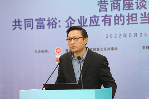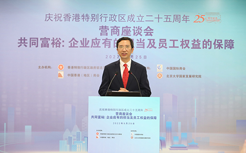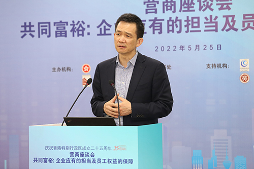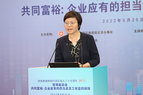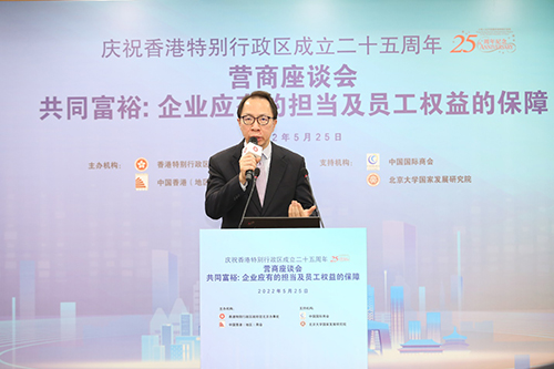 5月25日,由驻京办与中国香港(地区)商会主办的「共同富裕:企业应有的担当及员工权益的保障」庆祝香港特别行政区成立二十五周年营商座谈会在北京举行,吸引了830多名港资企业代表、港人等在线参与。中国国际商会和北京大学国家发展研究院为活动支持机构。