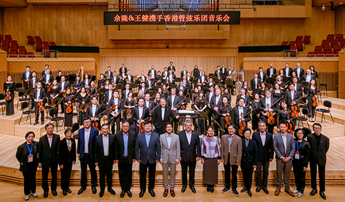 郑伟源(左八)、驻辽宁联络处主任冯伯豪(左六)、驻京办文化交流总监连美娇(右二)、驻辽宁联络处副主任陈志煌(左二)、驻京办新闻主任陈嘉荣(右三)与香港管弦乐团行政总裁霍品达(右八)、黑龙江省作家协会主席迟子建(右七)、哈尔滨音乐学院院长杨燕迪(右六)、黑龙江省港澳事务办公室二级巡视员银扫尘(左七)、哈尔滨市外事办公室二级巡视员徐广为(左五)等嘉宾在演出结束后和香港管弦乐团合照。