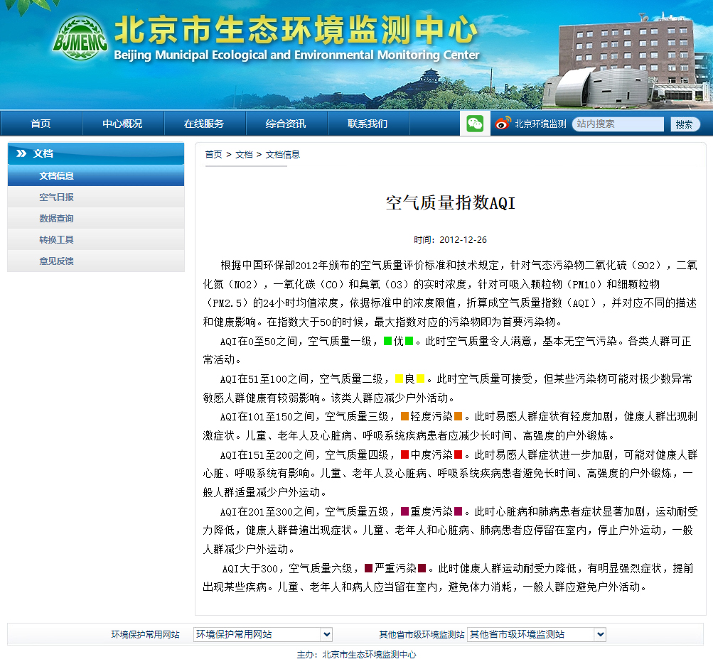 北京市環保監測中心每日對北京的空氣品質進行預報,同時綜合考慮空氣污染程度和持續時間,將空氣重度污染分爲優、良、輕度污染、中度污染、重度污染、嚴重污染級別。旅居北京人士也可不時留意其他相關機構或組織有關北京空氣品質的公布及建議的防護措施。