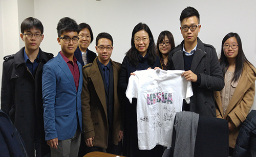在中國人民大學就讀的香港學生向傅小慧(右四)致送紀念品。